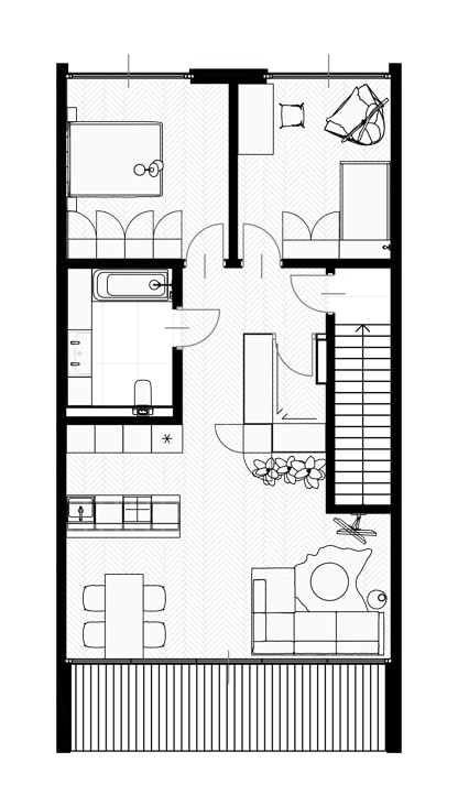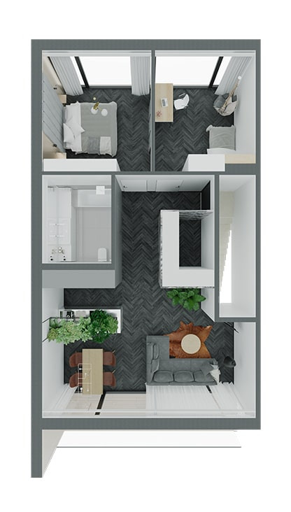Apartament na piętrze składa się z 5 pomieszczeń o łącznej powierzchni 83,79m2. Mieszkanie wykończone jest do stanu deweloperskiego. W standardzie oprócz pełnej instalacji elektrycznej zawiera także instalacje pod fotowoltaikę oraz pod system inteligentnego domu. W całym apartamencie zastosowane jest ogrzewanie podłogowe za pomocą pieca elektrycznego, a do ogrzewania wody użyty został bojler elektryczny. W celu zapewnienia prawidłowej wentylacji pomieszczeń w całym budynku zainstalowana została rekuperacja. Dla osób chcących zwiększyć standard apartamentu, umożliwiamy wybranie dodatkowych opcji tj. klimatyzacja, trawa z rolki, rolety zewnętrzne i inne znajdujące się w konfiguratorze.