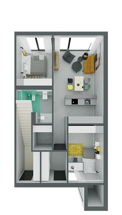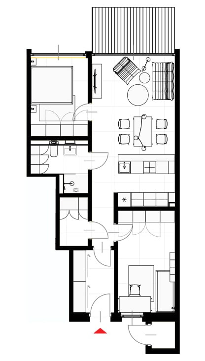 Apartament na parterze składa się z 7 pomieszczeń o łącznej powierzchni 69,60m2. Mieszkanie wykończone jest do stanu deweloperskiego. W standardzie oprócz pełnej instalacji elektrycznej zawiera także instalacje pod fotowoltaikę oraz pod system inteligentnego domu. W całym apartamencie zastosowane jest ogrzewanie podłogowe za pomocą pieca elektrycznego, a do ogrzewania wody użyty został bojler elektryczny. W celu zapewnienia prawidłowej wentylacji pomieszczeń w całym budynku zainstalowana została rekuperacja. Dla osób chcących zwiększyć standard apartamentu, umożliwiamy wybranie dodatkowych opcji tj. klimatyzacja, trawa z rolki, rolety zewnętrzne i inne znajdujące się w konfiguratorze.